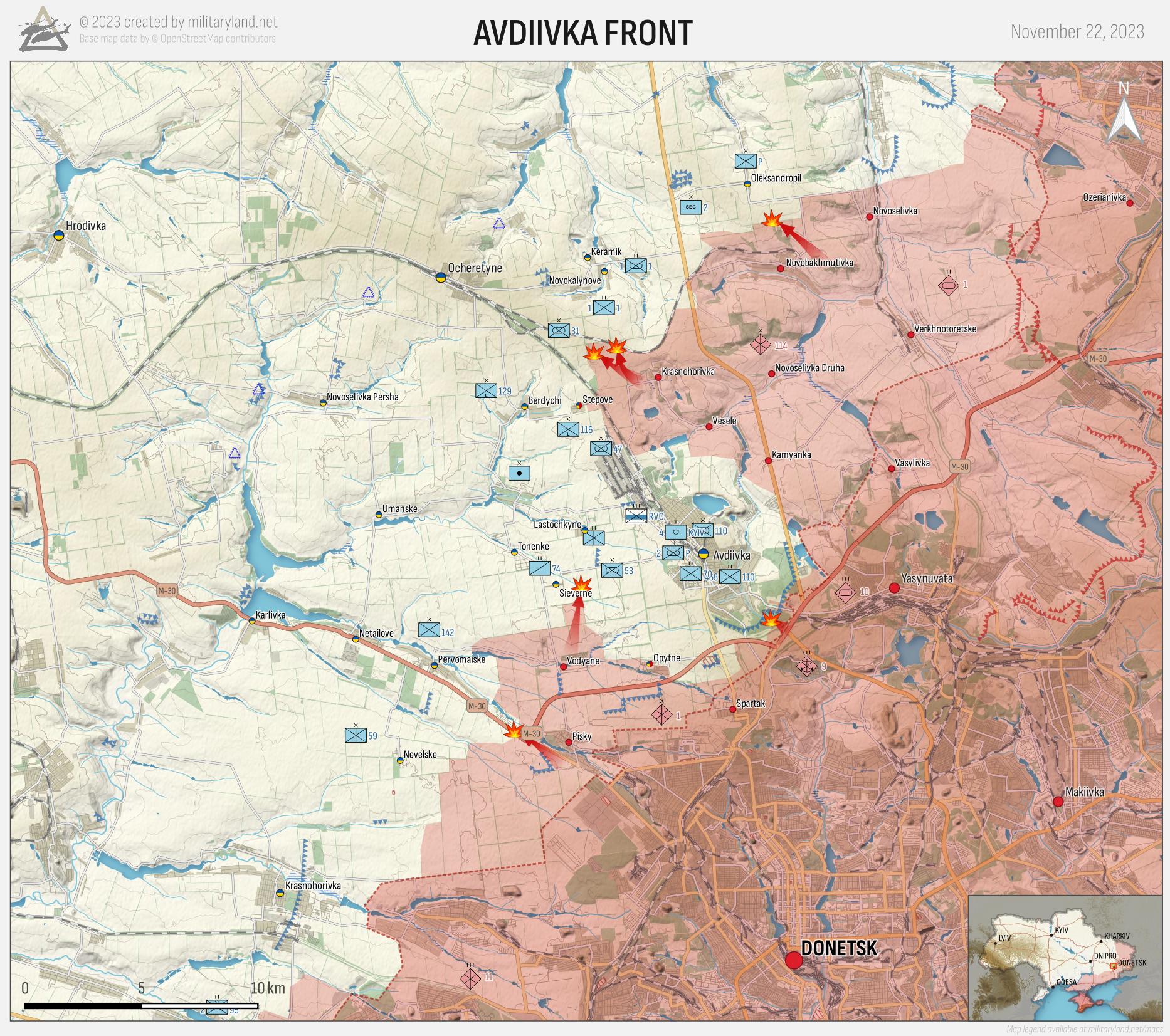 Significant action. The Russian Avdiivka Offensive is ongoing. Fighting reported northwest of Horlivka. Fighting reported southeast of Novokalynove. Russian attacks around Stepove repelled. Russian attacks north of Avdiivka possibly made gains. Russian attacks southeast of Avdiivka made marginal gains. Russian attacks south of Avdiivka repelled. Russian attacks around Sieverne repelled. Russian attacks around Pervomaiske repelled. Russian attacks around Krasnohorivka repelled. Russian attacks around Marinka repelled. Russian attacks near Novomykhailivka repelled.