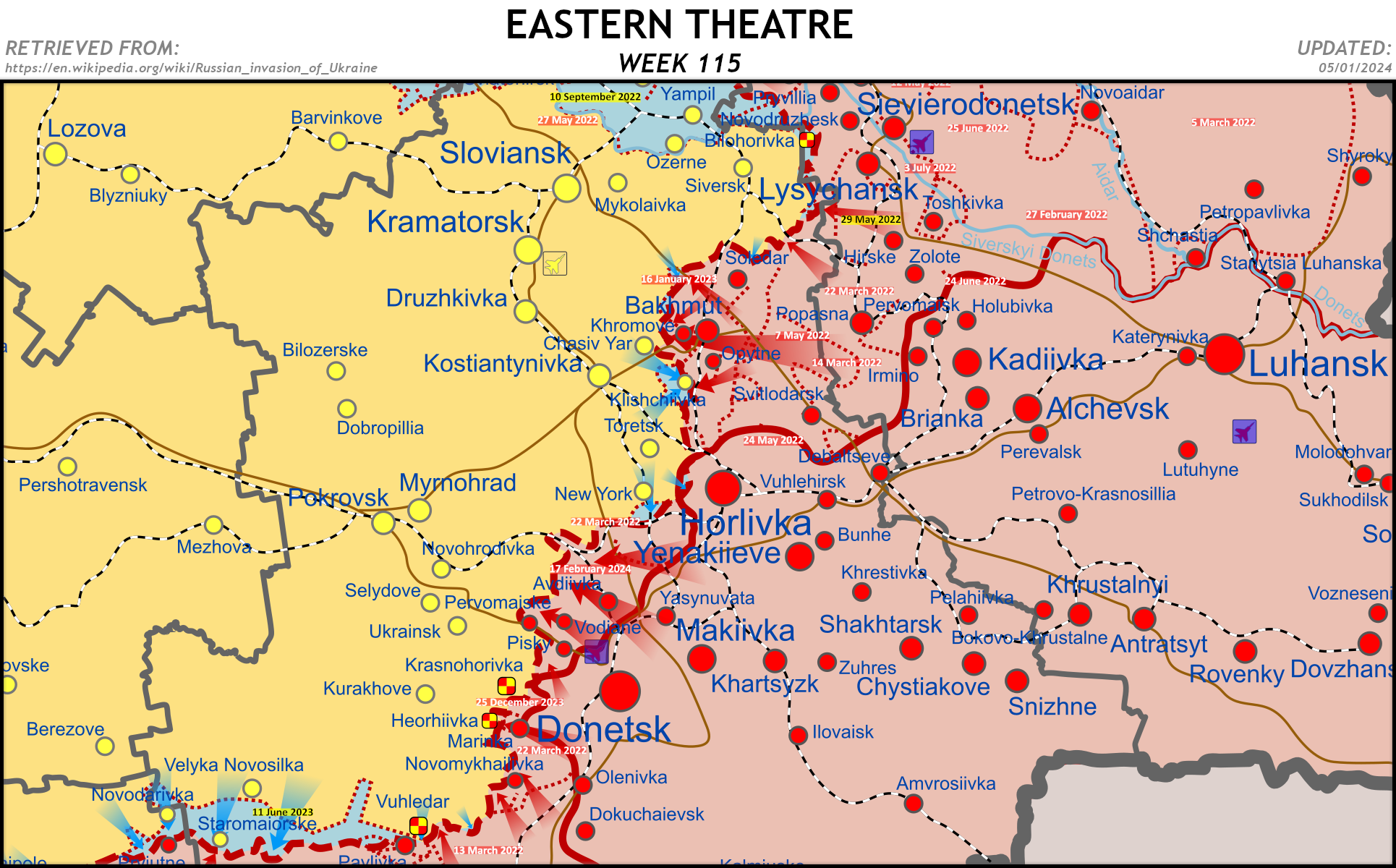 🟧 Significant action. Russian attacks east of Siversk repelled. Russian attacks north of Soledar repelled. Russian attacks east of Chasiv Yar made marginal gains. Fighting reported south of Bakhmut. Fighting reported west of Horlivka. Russian attacks northwest of Avdiivka made gains. Russian assaults in Krasnohorivka made gains. Russian attacks around Novomykhailivka made gains. Russian forces captured Novomykhailivka. Fighting reported around Marinka.