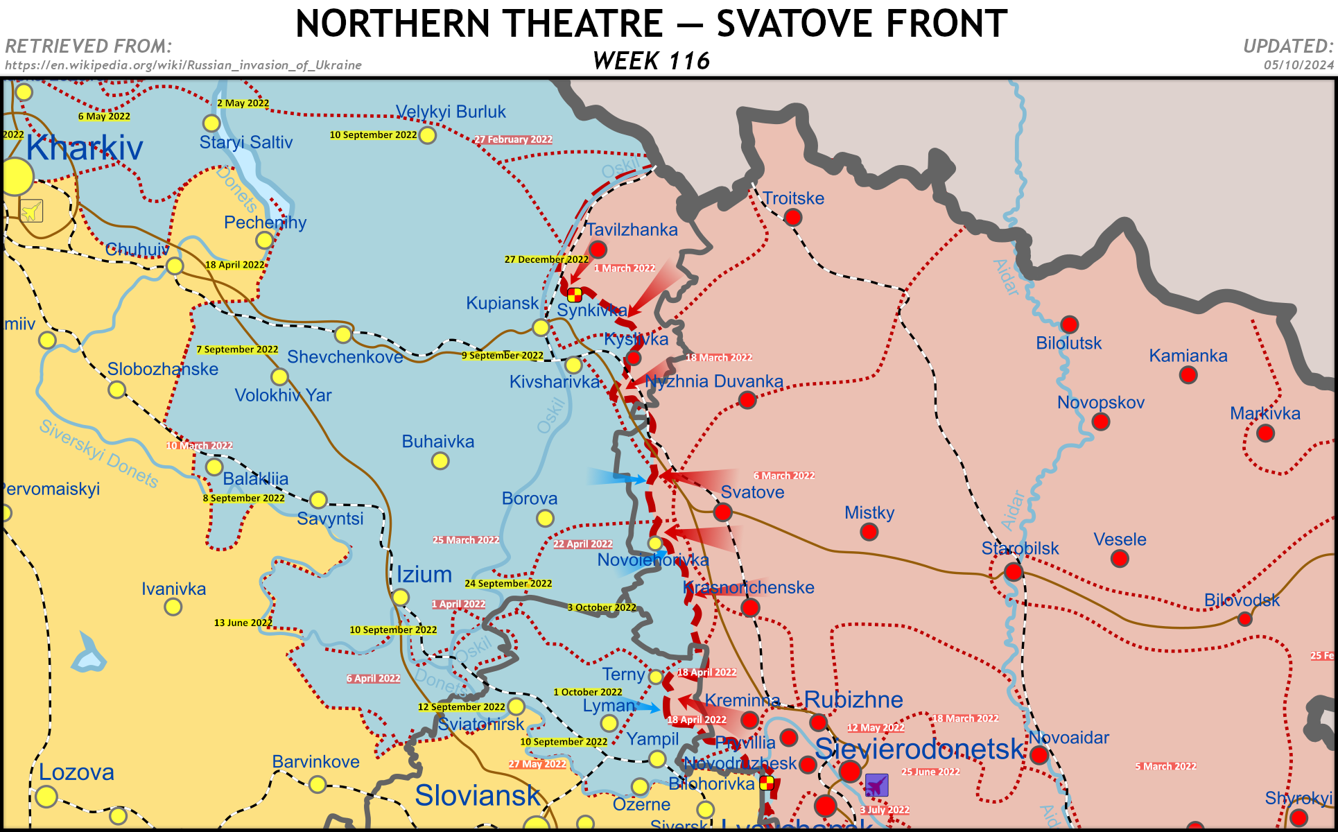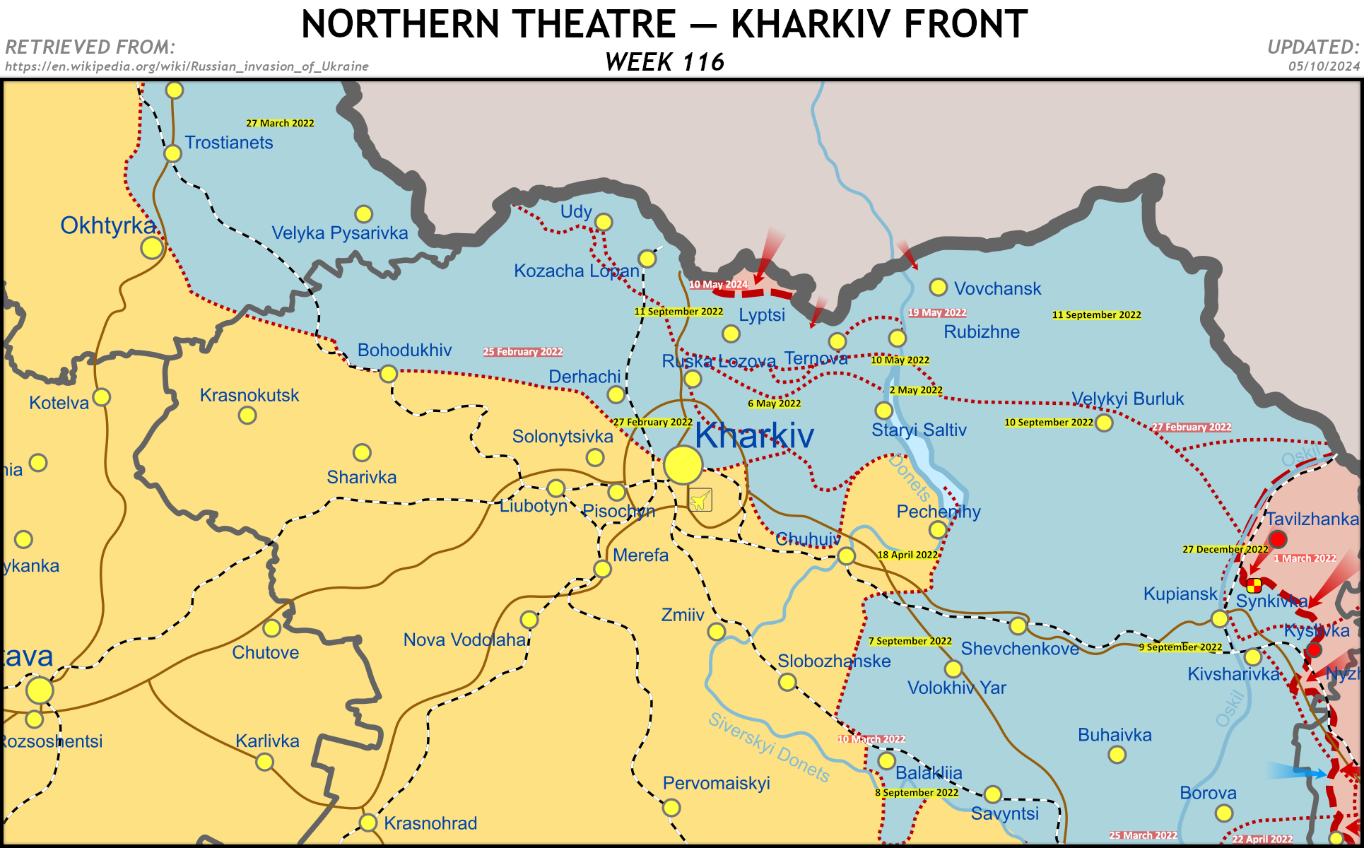 🟥 Major action. Russian forces captured Strilecha, northeast of Kharkiv. Russian forces captured Krasne, northeast of Kharkiv. Russian forces captured Pylna, northeast of Kharkiv. Russian forces captured Borisivka, northeast of Kharkiv. Russian attacks towards Vovchansk likely made marginal gains. Fighting reported northeast of Kupyansk. Russian forces captured Kyslivka. Russian forces captured Kotlyarivka. Russian attacks northwest of Svatove made limited gains. Fighting reported southwest of Svatove. Russian attacks west of Kreminna made marginal gains. Fighting reported southwest of Kreminna.
