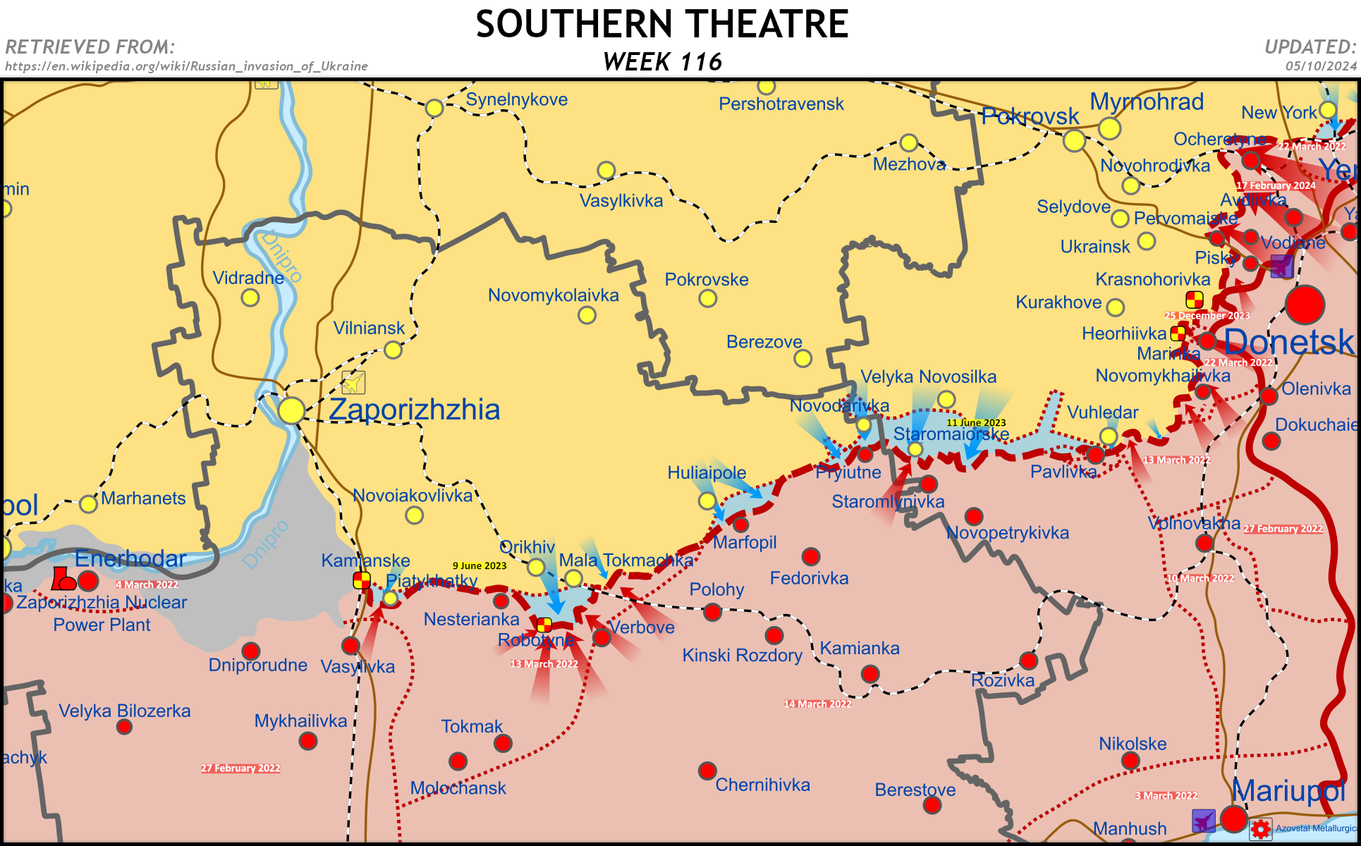 🟩 Limited action. Russian assaults in Urozhaine, south of Velyka Novosilka, made gains. Russian attacks around Staromaiorske made marginal gains. Fighting reported southwest of Velyka Novosilka. Fighting reported northwest of Verbove. Russian assaults in Robotyne made marginal gains.